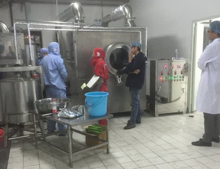 機組由主機、配料噴霧供給、凈化熱風(fēng)、除塵排風(fēng)及電氣操作等系統(tǒng)和部件組成。包衣的素蕊在包衣筒內(nèi)轉(zhuǎn)動,不停地作復(fù)雜軌跡運動;由噴霧供料系統(tǒng)加壓,通過噴槍或滴管自動將包衣介質(zhì)噴灑在素蕊表面,同時,由熱風(fēng)柜提供的潔凈熱空氣穿過素蕊層,使噴在素蕊表面形成的包衣介質(zhì)迅速干燥,使素蕊表面快速形成一層堅固致密、光滑的表面薄膜。