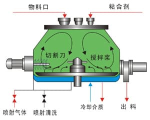 1、粉狀物料從錐形料斗上方進入物料鍋,待料斗關閉后在混合槳的攪拌下,粉料在容器內作旋轉運動,同時物料沿錐形壁方向變化,逐步生成液橋。在槳葉和筒壁對物料的擠壓、磨擦、捏合的作用下,物料逐步轉變為疏松的材質。然后,開啟出料門,濕顆粒在槳葉離心力作用下推動出料斗。