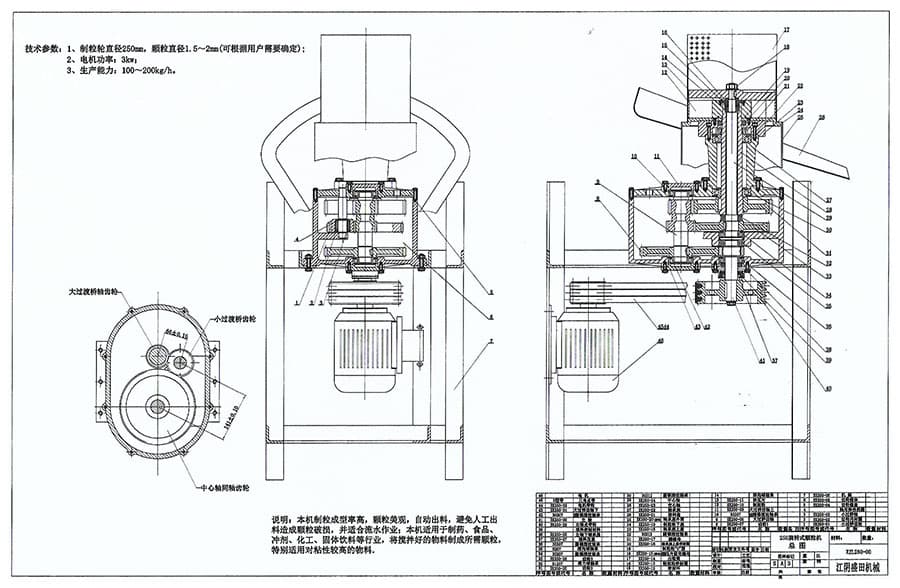 顆粒機凡與物料接觸部分均采用不銹鋼制造,外型美觀,結構合理,制粒成型率高,顆粒美觀,自動出料,避免人工出料造成的顆粒破損,并適合流水作業。利用一組倒順旋轉碾刀的作用,通過不銹鋼篩孔擠壓成顆粒。特別是食品工業中用于雞精生產線生產雞精.味精及固體飲料。并可根據用戶需要選擇不同孔徑的篩筒,與物料接觸部位均采用不銹鋼材料制成,能確保物料的本色而不變質。