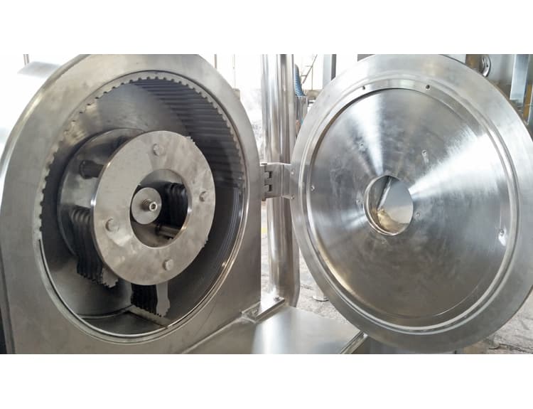 本機屬高速運轉機械,采用錘片式刀片,刀片可兩面更換使用,被粉碎物料經高速刀片剪切獲得粉碎。該機還可根據不同物料選用各種形狀及尺寸不同的刀片,粒度大小通過更換篩網獲得。