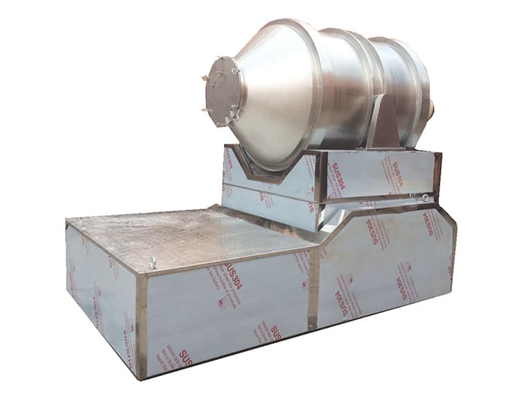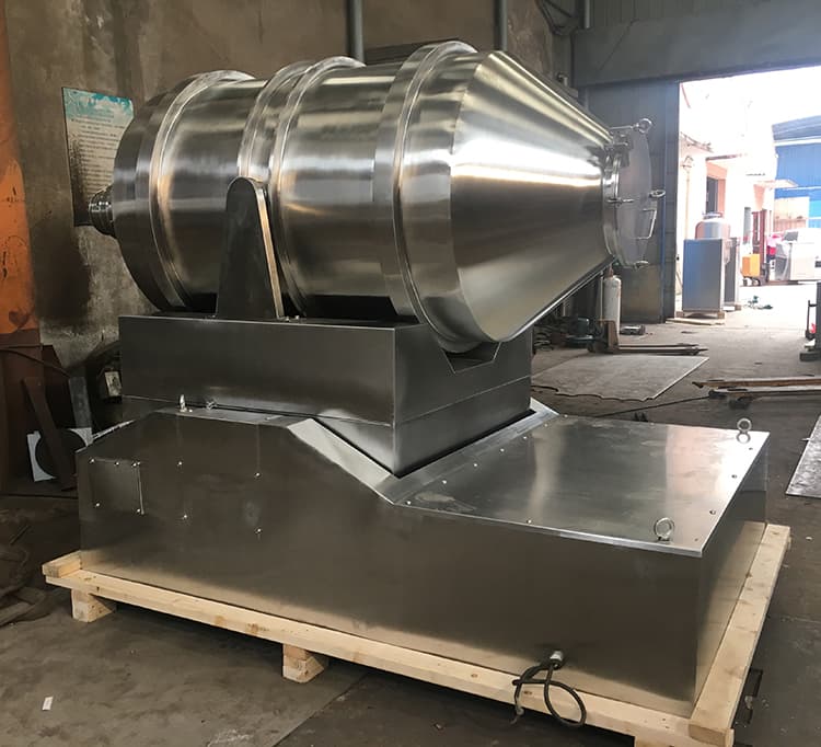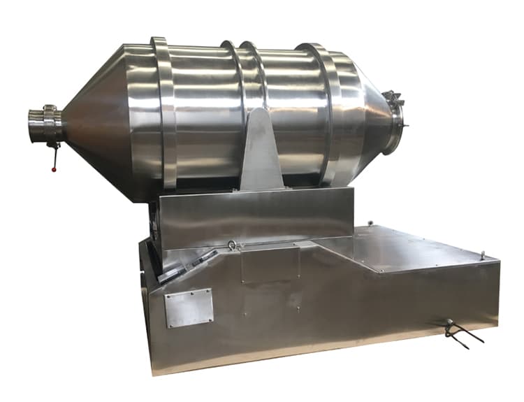 混合筒為圓柱形料筒,筒內不帶任何攪拌裝置,在繞其對稱軸作自軸的同時,又繞水平軸作“可倒置”搖擺運動,從而迫使料筒內的物料既有擴散混合又有移動混合。