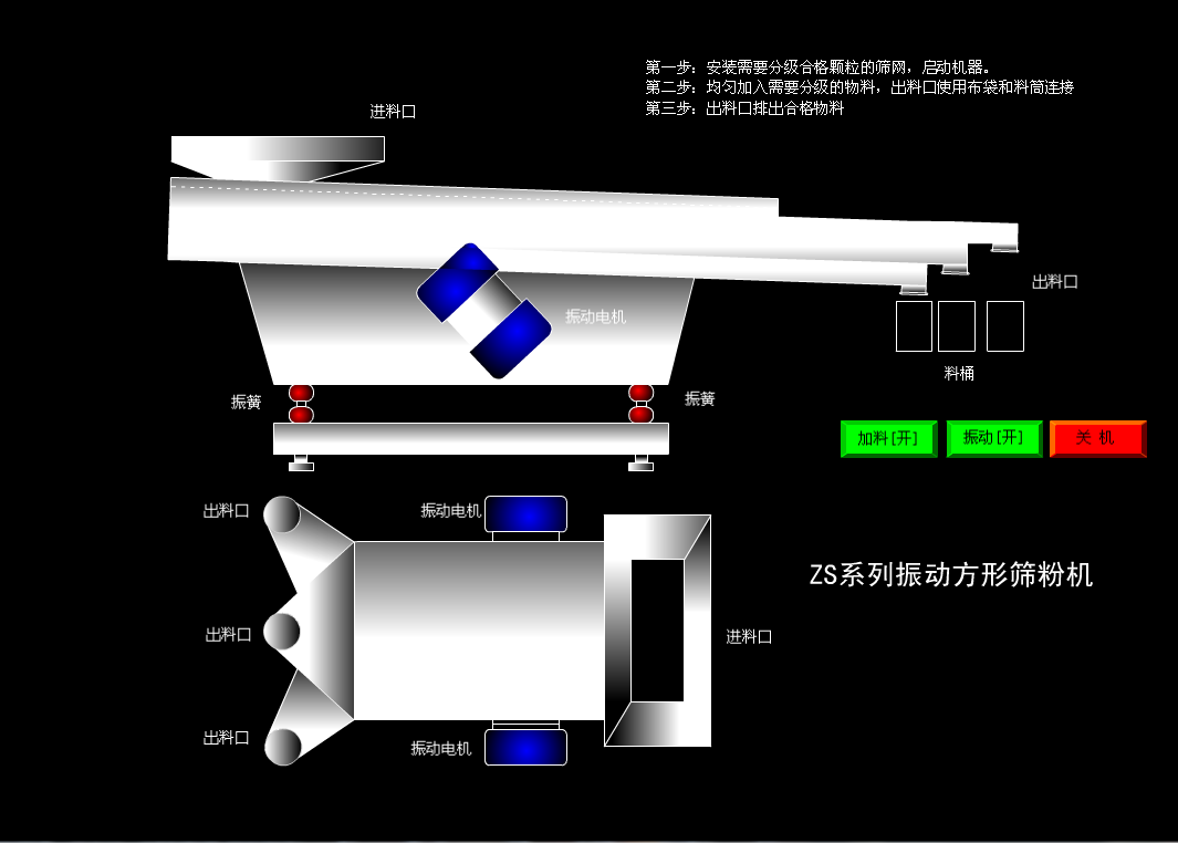 本機由篩箱,振動源及減震器三大部分組成。振動機架與篩箱連接有4-12組軟橡膠減震器上下固定, 產生離心力,由震器控制浮動振幅,